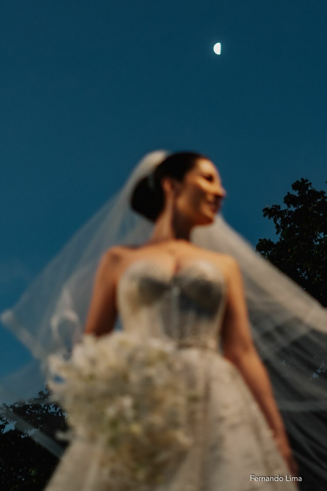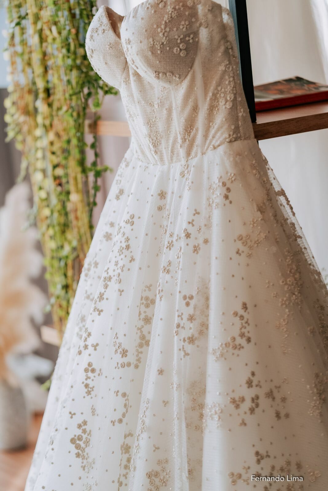 O vestido, assinado pelo Espaço WM, trouxe um corte impecável, com caimento fluido e acabamento refinado, valorizando o estilo da noiva com sofisticação e leveza.
