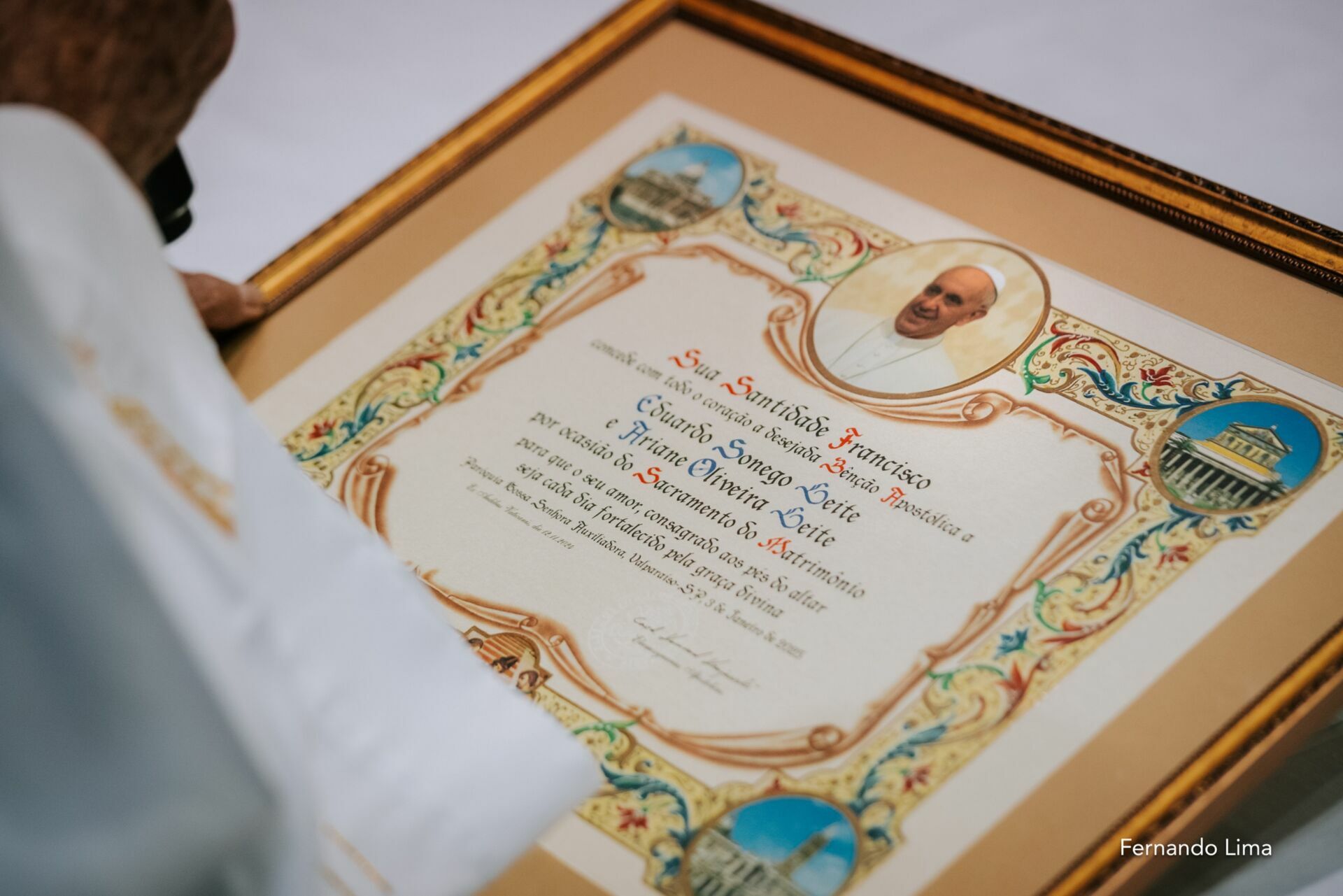 O momento mais marcante? A homenagem especial do Papa Francisco, que trouxe ainda mais significado a esse dia tão esperado. Um verdadeiro presente para os noivos e suas famílias, tornando essa celebração ainda mais única e inesquecível.